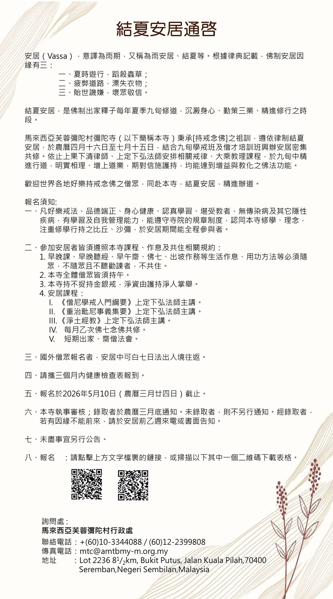 歡迎世界各地好樂持戒念佛之僧眾,同赴本寺,結夏安居,精進辦道。