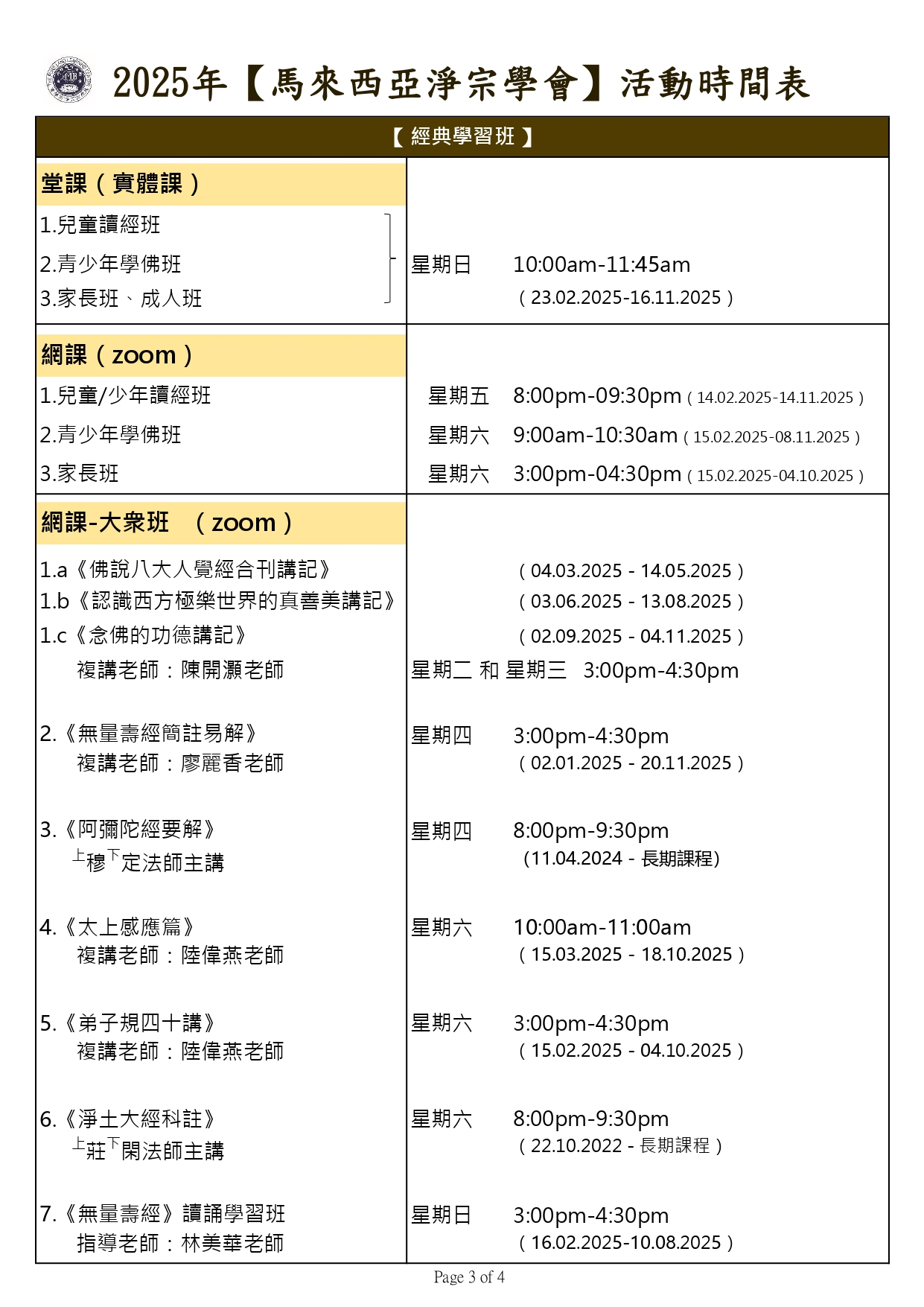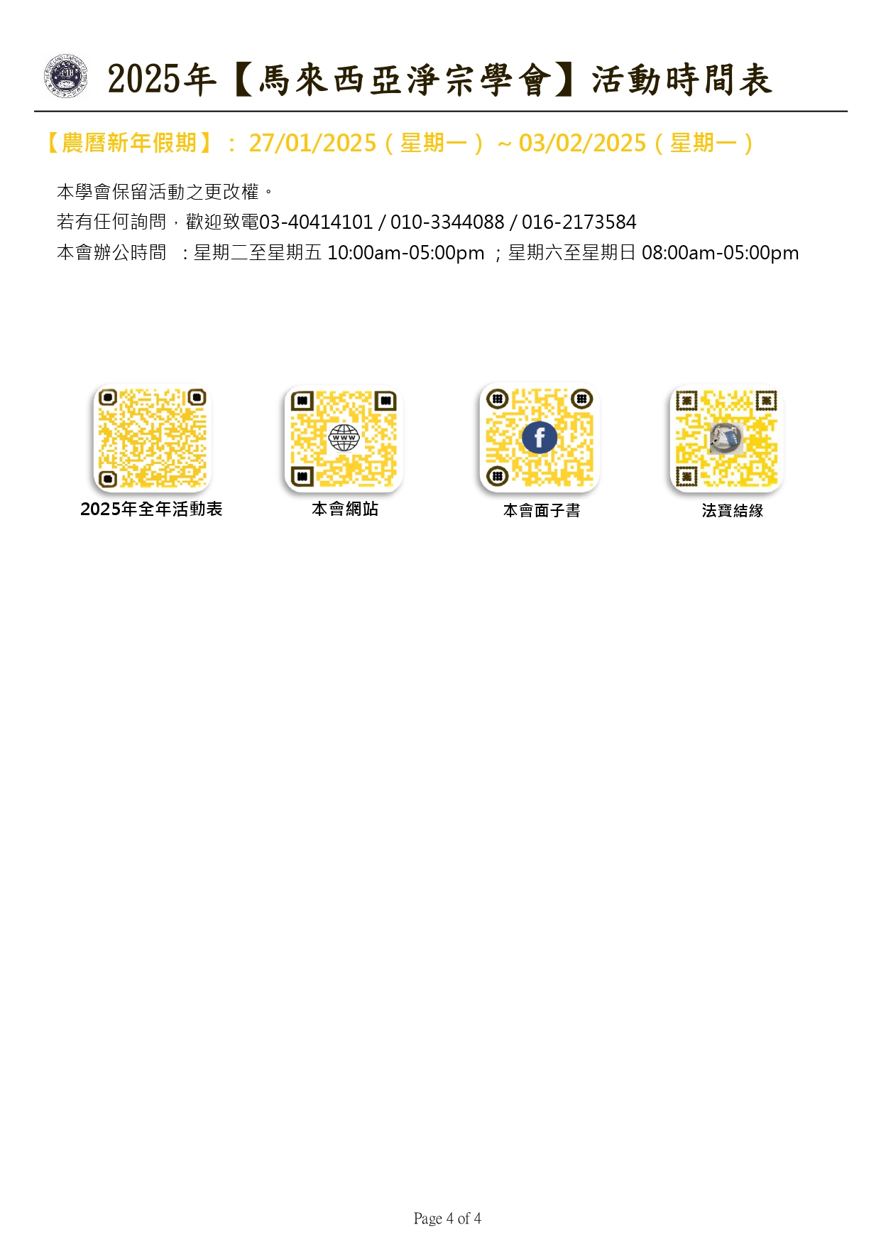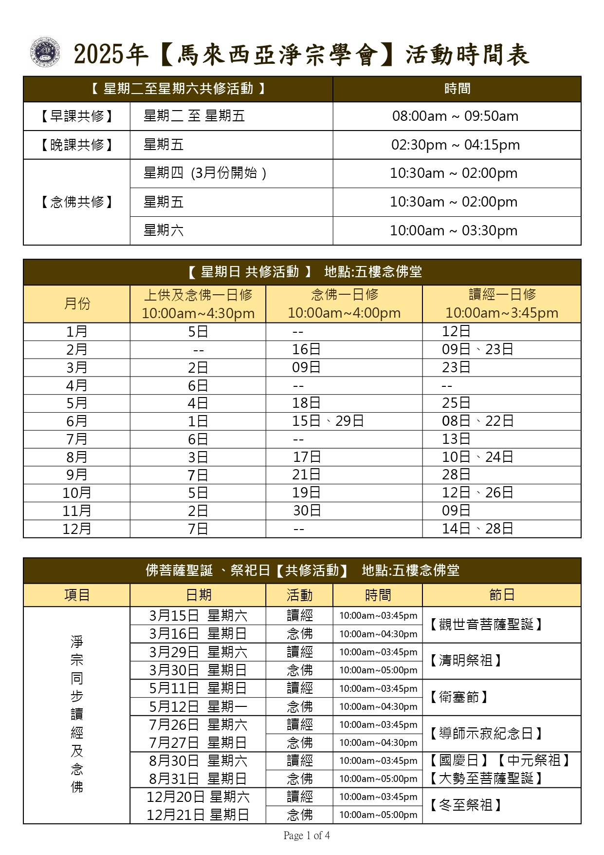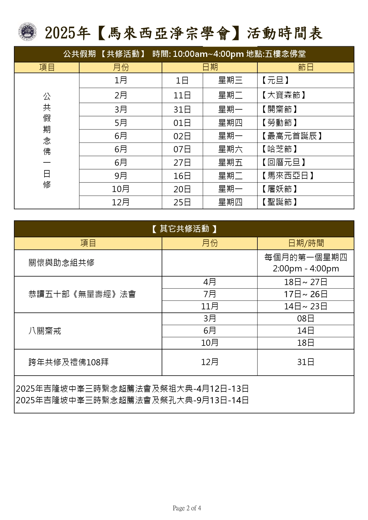 2025年 【馬來西亞淨宗學會】 全年活動時間表